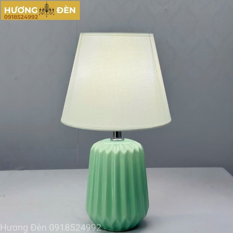 Chiếc đèn bàn DB99 nổi bật với thân đèn bằng gốm cao cấp phủ màu xanh ngọc nhẹ nhàng, kết hợp phần kim loại chắc chắn tạo nên tổng thể sang trọng nhưng không cầu kỳ. Chao đèn vải trắng giúp khuếch tán ánh sáng mềm mại, hạn chế chói mắt, đồng thời tăng tính thẩm mỹ cho không gian. Sự phối hợp giữa chất liệu gốm, kim loại và vải mang lại độ bền cao cũng như vẻ đẹp hiện đại tinh tế.