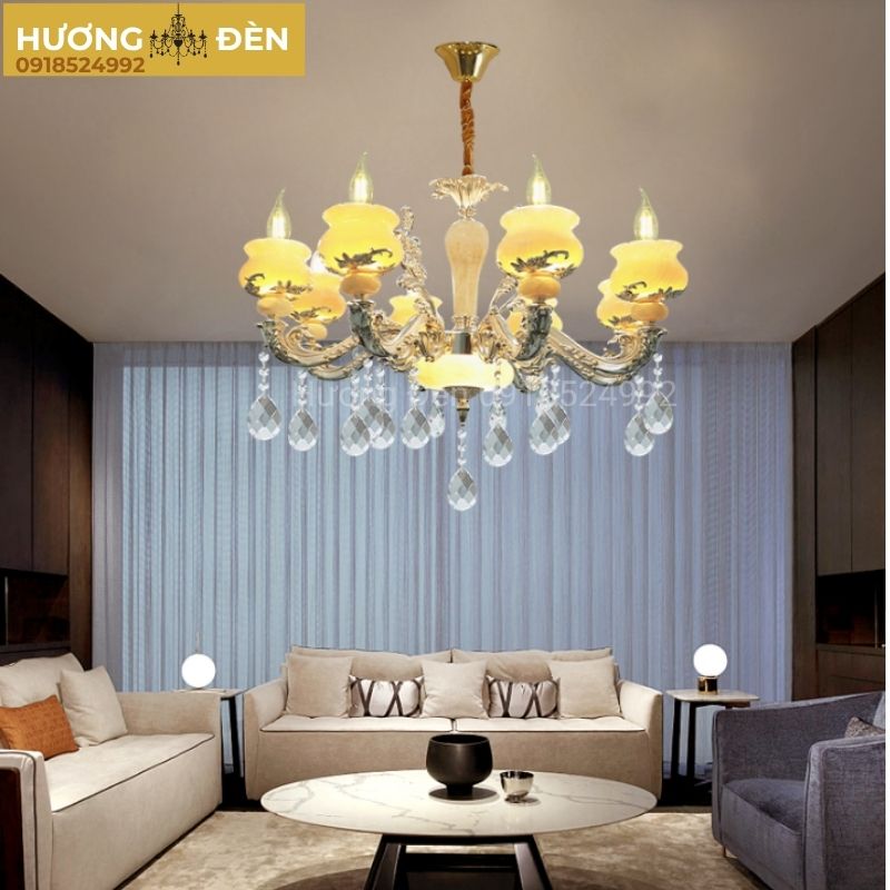 Chiếc đèn chùm pha lê này được thiết kế theo phong cách cổ điển châu Âu, lấy cảm hứng từ vẻ đẹp quý phái của những lâu đài hoàng gia. Phần thân đèn bằng đồng kết hợp cùng chao đá và pha lê cao cấp giúp phản chiếu ánh sáng lung linh, tạo cảm giác ấm áp và sang trọng cho phòng khách, sảnh chờ, biệt thự hay không gian nhà hàng cao cấp.