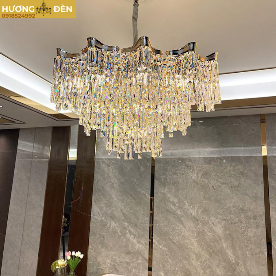 Các dải pha lê K9 cao cấp được xếp lớp khéo léo tạo hiệu ứng thác pha lê uốn lượn. Khi đèn sáng, ánh sáng phản chiếu qua từng viên pha lê tạo nên vẻ lung linh, ấm áp nhưng vẫn rất sang trọng – đặc trưng của dòng đèn thả cao cấp.