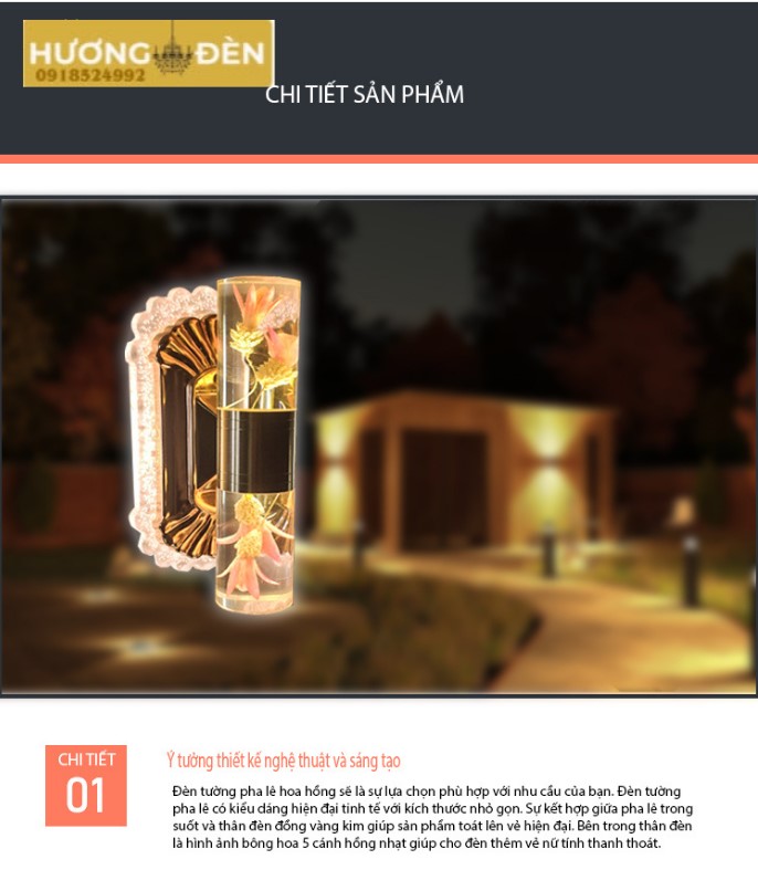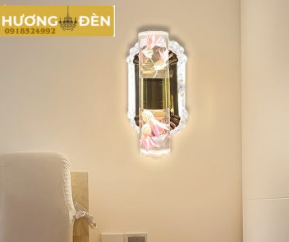 Phòng ngủ là không gian cần sự yên tĩnh, nhẹ nhàng trong ngôi nhà. Thông thường, phòng ngủ có diện tích khá nhỏ chỉ khoảng 15 – 20m2. Việc bố trí nội thất đèn trang trí cho phòng ngủ sao cho vừa nhẹ nhàng không bị gắt, vừa nhỏ gọn tiện lợi là điều không hề dễ dàng. Điều này đòi hỏi người thiết kế phải lựa chọn màu sắc, kích thước, loại đèn và cách bố trí sao cho phù hợp với nhu cầu của từng cá nhân.Đèn pha lê hoa hồng sẽ là sự lựa chọn phù hợp với nhu cầu của bạn. Đèn treo tường pha lê phòng ngủ có kiểu dáng hiện đại tinh tế với kích thước nhỏ gọn. Sự kết hợp giữa pha lê trong suốt và thân đèn đồng vàng kim giúp sản phẩm toát lên vẻ hiện đại. Bên trong thân đèn là hình ảnh bông hoa 5 cánh hồng nhạt giúp cho đèn thêm vẻ nữ tính thanh thoát.